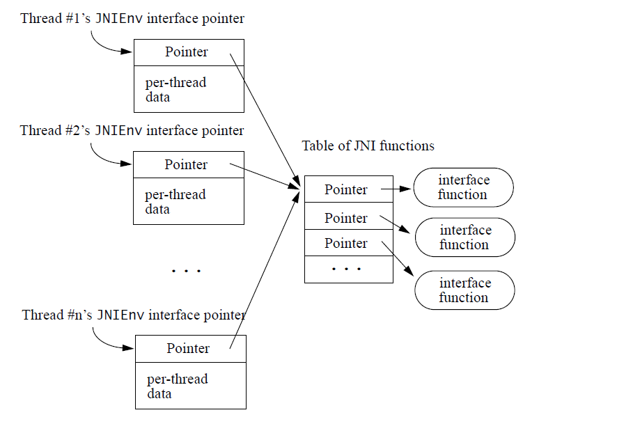 JNIEnv其实是一个指向本地线程数据的接口指针,指针里面包含指向函数接口的指针,每一个接口函数在这表中都有一个预定义的偏移位置,类似C++虚函数表。