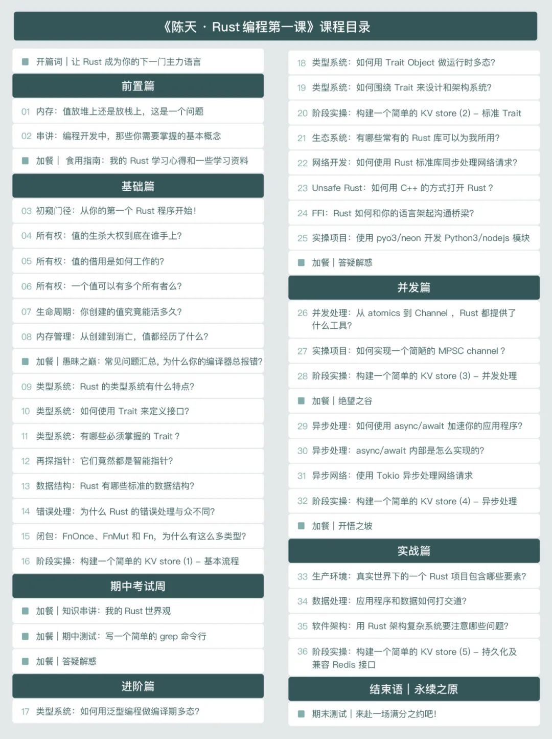 学会用最合适的工具解决最合适的问题很重要。这个模块将带你从底层的 atomics 一路向上,历经 Mutex、Semaphore、Channel,直至 actor model,探索不同的并发手段。你会深度了解到,其他语言中被奉为圭臬的并发手段,在 Rust 里,只不过是一种并发工具。
