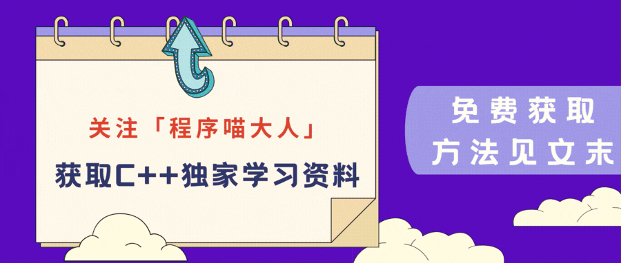 C++学习资料免费获取方法:关注程序喵大人,后台回复“程序喵”即可免费获取40万字C++进阶独家学习资料。