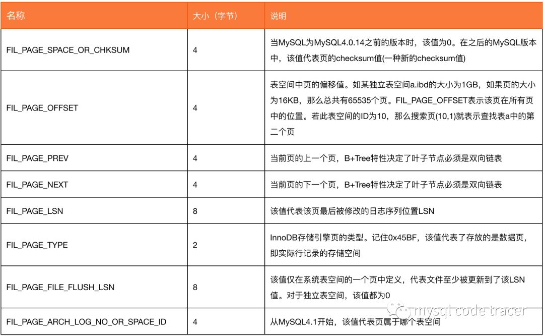 1、File Header结构,记录了page页的一些头信息,一共38字节