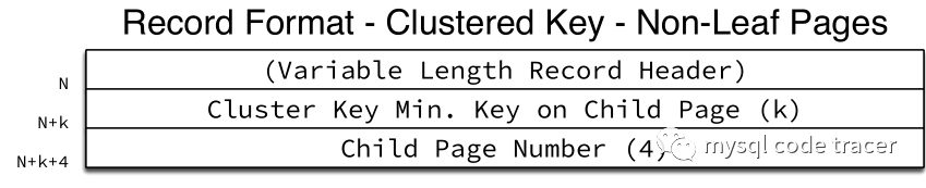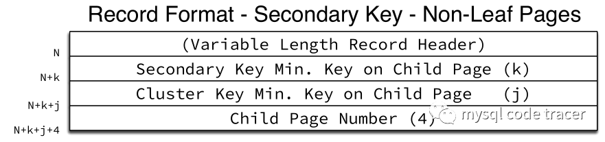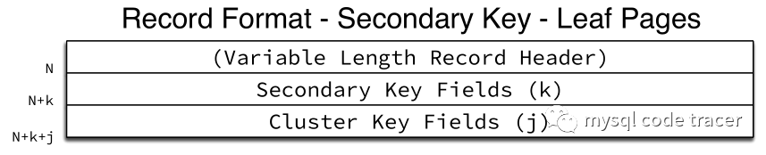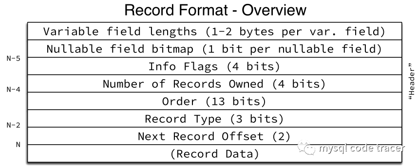 Record Header,根据主键类型不同占用字节数不同,例如一个int主键,Record Header为5字节,另外需要考虑变长类型、是否为空