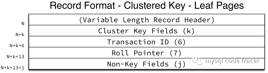 row header(5字节+可变长+非空占位符)+ 主键key长度(如果没有显示声明默认会创建6字节row id)+ trxid6字节+ rollptr7字节