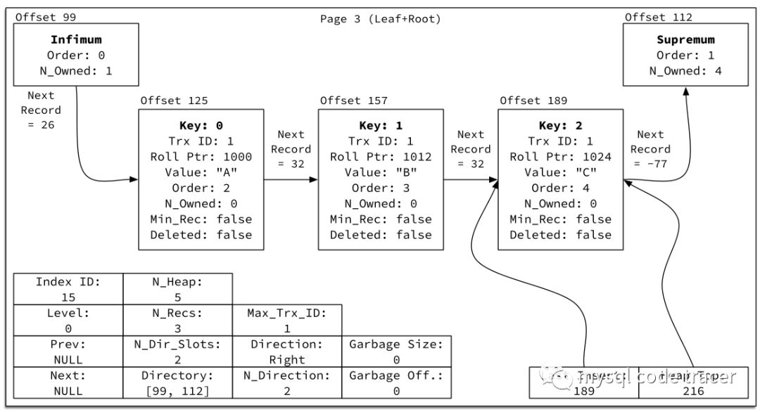 用户所有插入的记录都存放在这里,默认情况下记录跟记录之间没有间隙,但是如果重用了已删除记录的空间,就会导致空间碎片。每个记录都有指向下一个记录的指针,但是没有指向上一个记录的指针。记录按照主键顺序排序。即,用户可以从数据页最小记录开始遍历,直到最大的记录,这包括了所有正常的记录和所有被delete-marked记录,但是不会访问到被删除的记录(PAGE_FREE)。