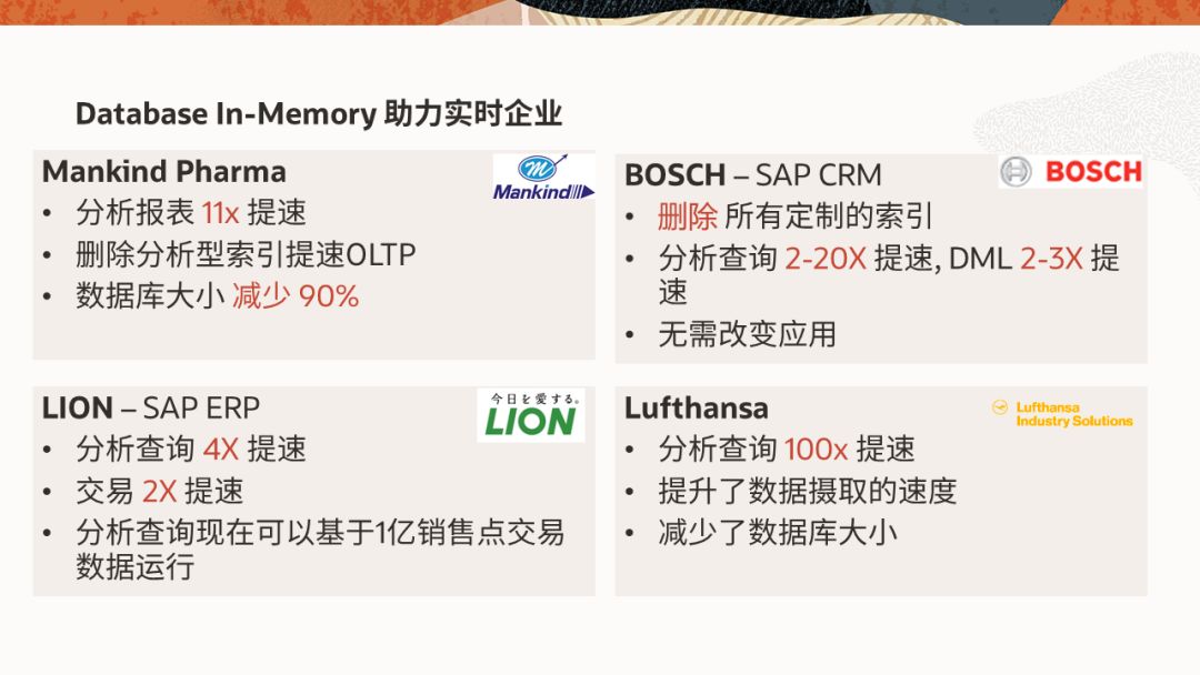 此外,零售商可以使用基于位置的分析来向客户手机实时发送个性化的优惠券,制造企业可以在生产过程中使用实时分析来监控产品质量并调整装配线的参数,这些都是很好的实时企业的范例。在Oracle官网,您也可以找到很多Database In-Memory客户案例的详细介绍。