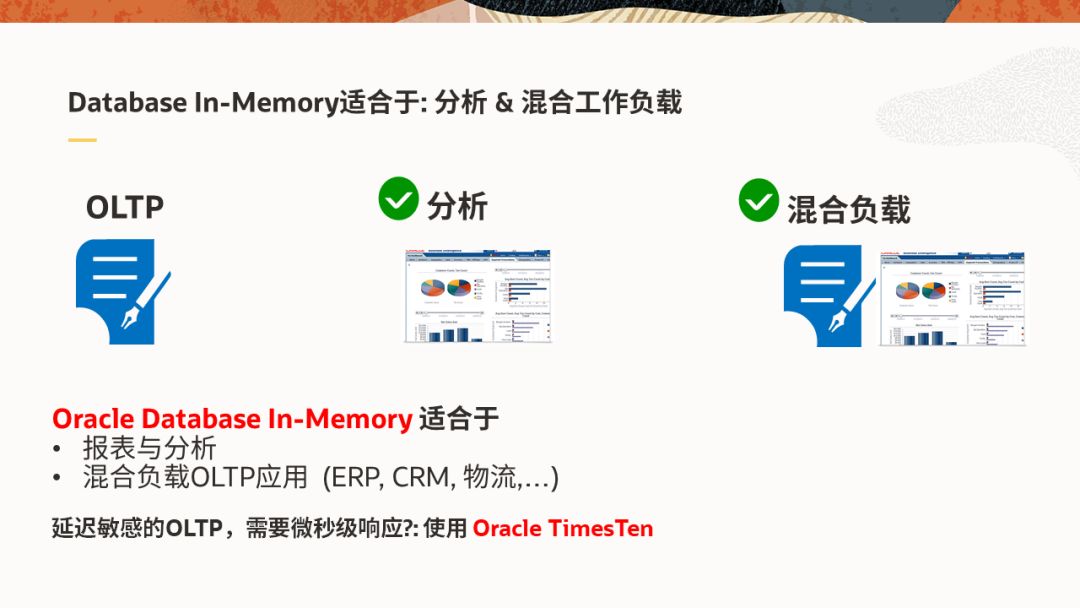 Database In-Memory非常适合于两类应用工作负载,一类是纯分析型,即Dashboard,统计报表和即席查询;另一类是混合工作负载,典型的如ERP,CRM等应用。对于需要微秒级响应,延迟敏感的OLTP应用,可以使用同属Oracle内存计算产品家族中的TimesTen内存数据库。