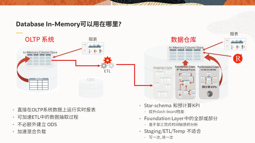 在架构层面,Database In-Memory可以在数据仓库,或直接在源OLTP系统上启用。在源端直接启用Database In-Memory,可避免额外再搭建一套ODS系统,同时由于Database In-Memory无需建立专门的分析型索引,还会带来简化管理和性能提升等好处。临时性的数据使用并不能从Database In-Memory中受益,如ETL中的暂存区域。但由于可以直接从内存中读取数据以及避免了更新分析型索引的开销,数据抽取和加载的速度都可以得到提升。