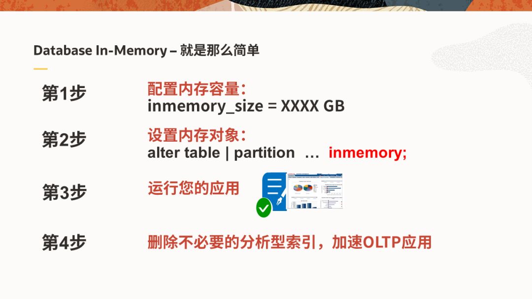 一个好的产品,无论内部机理多么复杂,技术如何高深,带给用户的始终应该是易用和一致的体验,Database In-Memory正是如此。对用户而言,您无需对应用做任何修改,只需在数据库端做简单的配置即可使用;对DBA而言,无需再维护复杂的分析型索引,在性能调优方面的工作也得到简化。