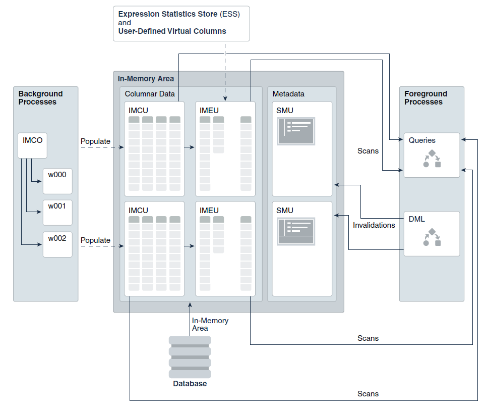 IMEU (In-Memory Expression Unit)是12.2版本新增的区域,存放的是虚拟列或频繁使用的表达式,是IMCU的延伸,IMEU和IMCU组成了列式存储:IMCS (In-Memory Column Store)。