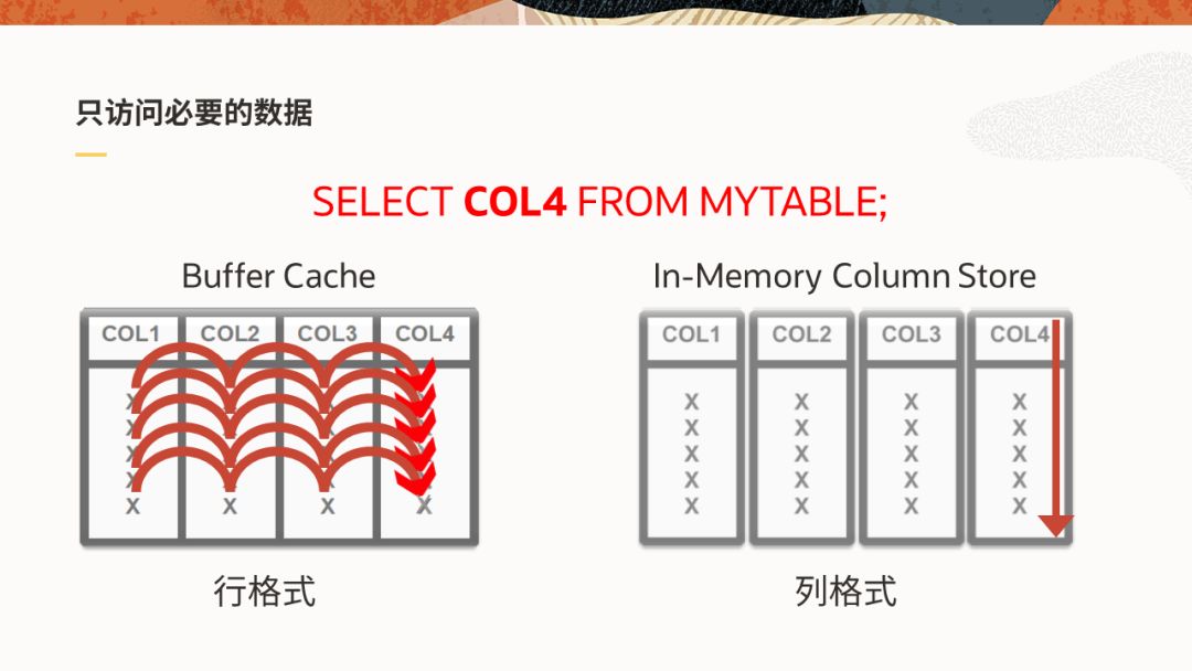 了解了Database In-Memory的基本架构,下面来解答一个经常被问到的问题:同样用到内存,为什么在分析查询时,Database In-Memory比Buffer cache要快?