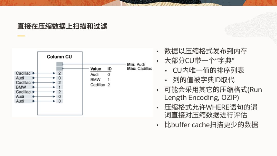 众所周知,压缩可以节省存储空间,但Database In-Memory使用压缩的主要目的是为了提高性能。这是如何做到的呢?原来在IMCU的列单元(CCU)中,存放的并不是列的原始数据,而是与原始数据对应的一个数字编码,这就是Database In-Memory默认压缩级中采用的字典压缩。字典是用此列中所有的不同值(distinct)进行排序,然后用数字编码对应所形成的。用数字编码代替原始值,本身就可以节省空间,想象一下用1来代替"阿里克谢·马克西莫维奇·彼什科夫"会带来多少空间节省,加之在一列中相同数据连续出现的概率较大,还可以进一步实施RLE算法进行压缩。更重要的是,数据无需解压就可以直接进行扫描和过滤,例如查询品牌为“BMW”的车,你只需查找编码为1的数据即可,这比常规的字符串操作高效得多,而且这样的操作可以利用SIMD硬件加速,后面再细说。另外在做Join,聚合等操作时,传递的是短得多的数字编码,效率也会提高很多。