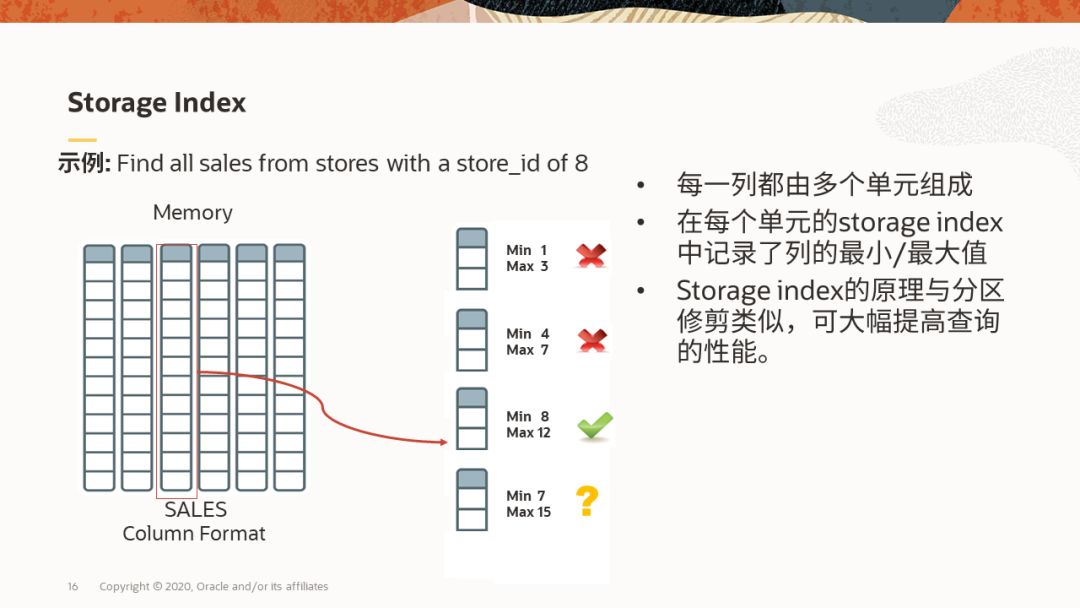 Storage Index并不是一项新的技术,在Exadata中早已采用,原理和分区裁剪类似,目的也是为了高效的过滤数据。前面谈到压缩时,我们注意到在IMCU的列存储单元CCU中,存放了此列在本单元中的最大值和最小值。利用这两个值,结合谓词下推,我们就可以将无关的IMCU快速排除,从而提升查询效率。除此以外,如果谓词是等式判断,我们还可以通过在字典中查询这个值是否存在来进一步实施裁剪。