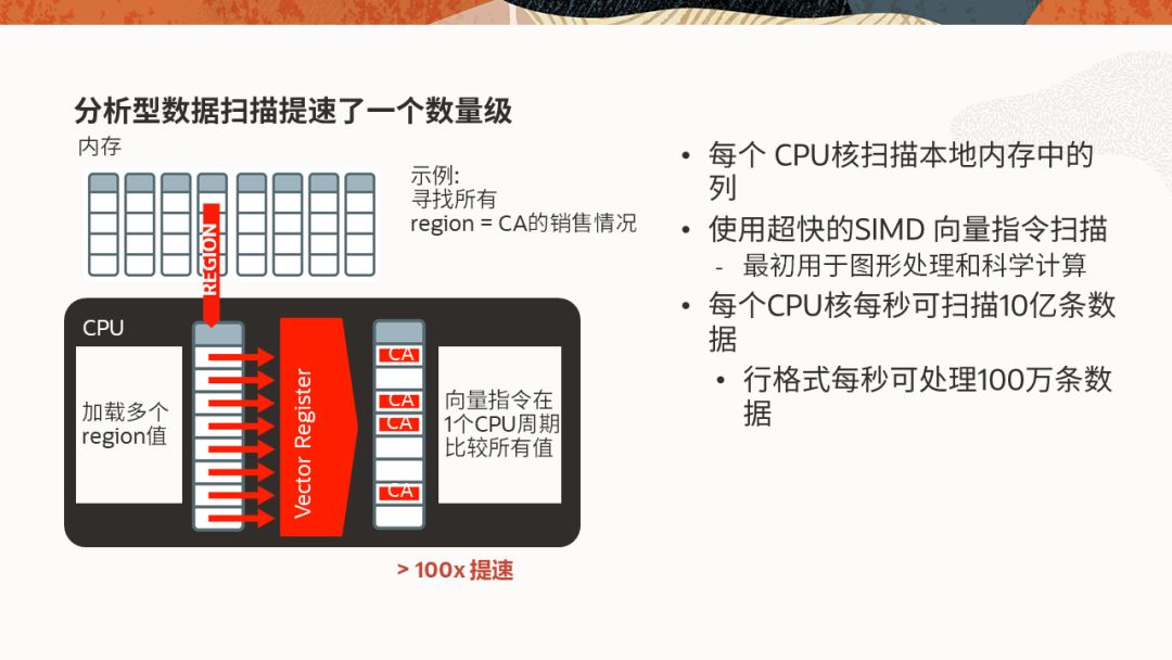 SIMD本质上是一种向量处理,就是一次性批量处理多个值,而不是像标量处理那样逐个执行。标量和向量的概念源自线性代数,标量表示单个值,向量则是由一系列相同类型的标量组成。例如在上图的例子中,需要查找REGION为CA(加州)的销售情况,标量处理时需要逐个比较。而在向量处理时,美国的50个州可以用8个bit表示,因此64 bit的向量寄存器一次就可以加载8个值进行比较,速度自然快多了。现在的向量寄存器已经支持256 bit,一次可比较的值就更多了。