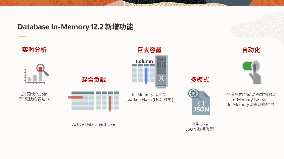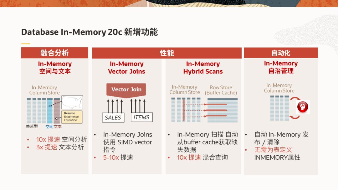 另外两项功能,In-Memory Text可实现内存中的文本,XML和JSON文档的搜索;In-Memory Vector Join可利用SIMD指令实现Join操作的加速。