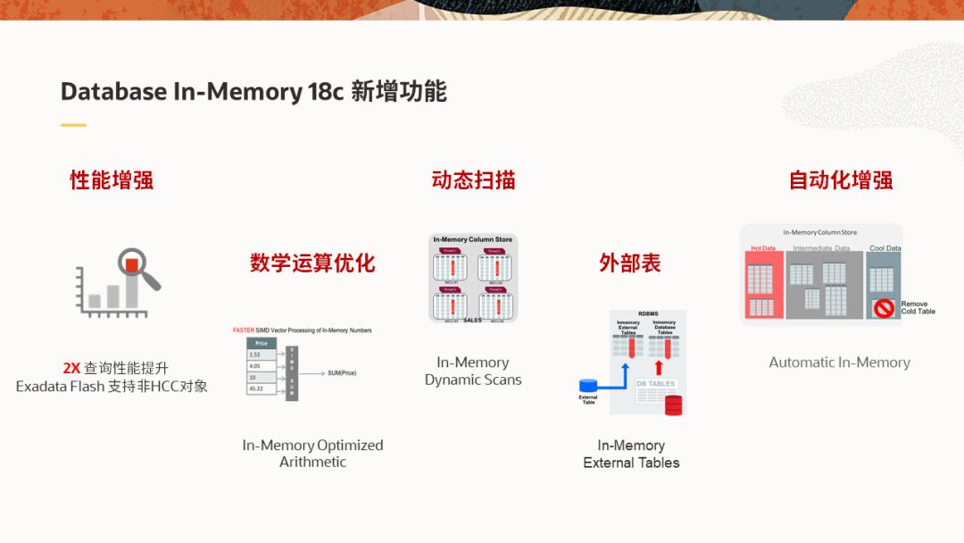 2018年2月16日,Oracle正式发布了数据库18c版本,18c是Oracle数据库首个按年度发布的版本。Database In-Memory在此版本中的增强主要体现在性能,大数据和自动化管理三方面。