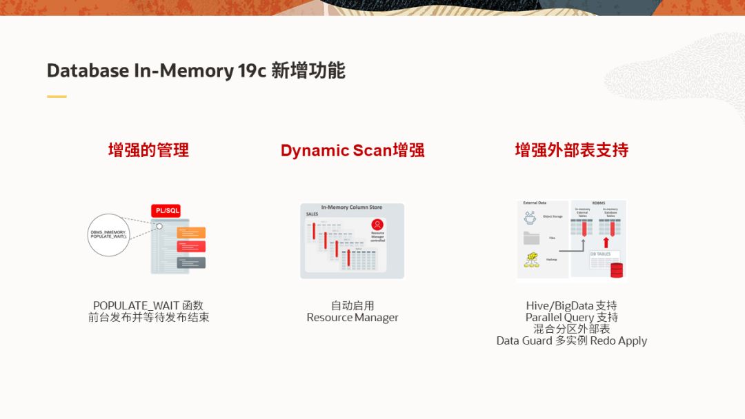 2019年2月13日,数据库19c版本率先在Exadata上得到支持。在此版本中,主要是对之前部分特性做了增强。例如In-Memory Dynamic Scan无需手动启用资源计划即可自动运行,POPULATE_WAIT支持前台发布,这样应用可以等到对象完全发布后再启动,带给用户良好的使用体验。在大数据方面,新增对Hive和HDFS两类外数据的支持,并支持混合分区外部表和对外部表的并行查询。