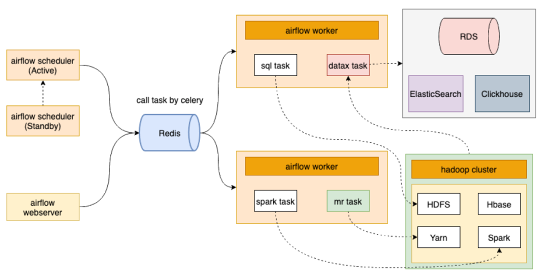 架构设计:我们采用了Airflow + Celery + Redis + MySQL的部署方案,Redis作为调度队列,通过Celery可以实现任意多台Worker的分布式部署(水平扩展)。
