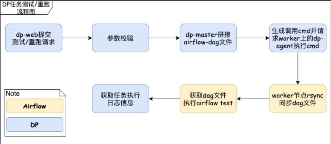 任务运行测试流程中,原先的DP-Airflow流程是通过dp的Master节点组装dag文件并通过DP Slaver同步到Worker节点上再执行Airflow Test命令执行任务测试。