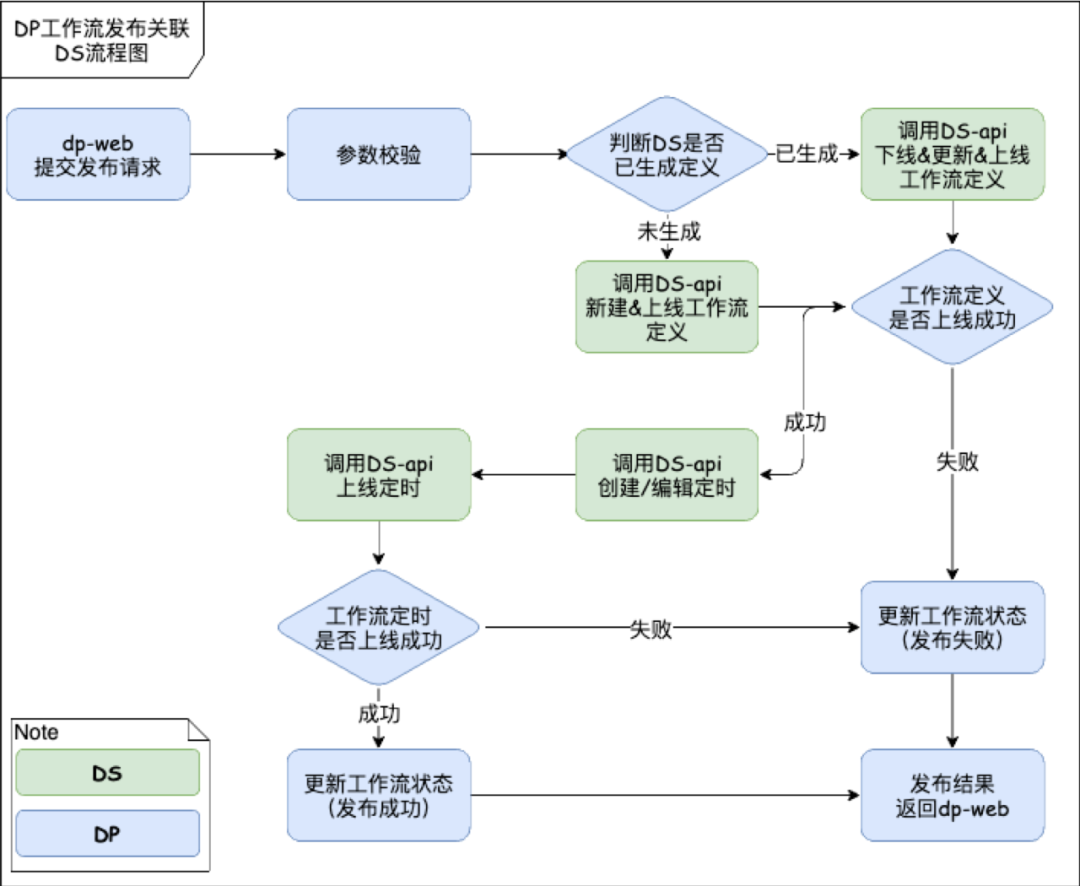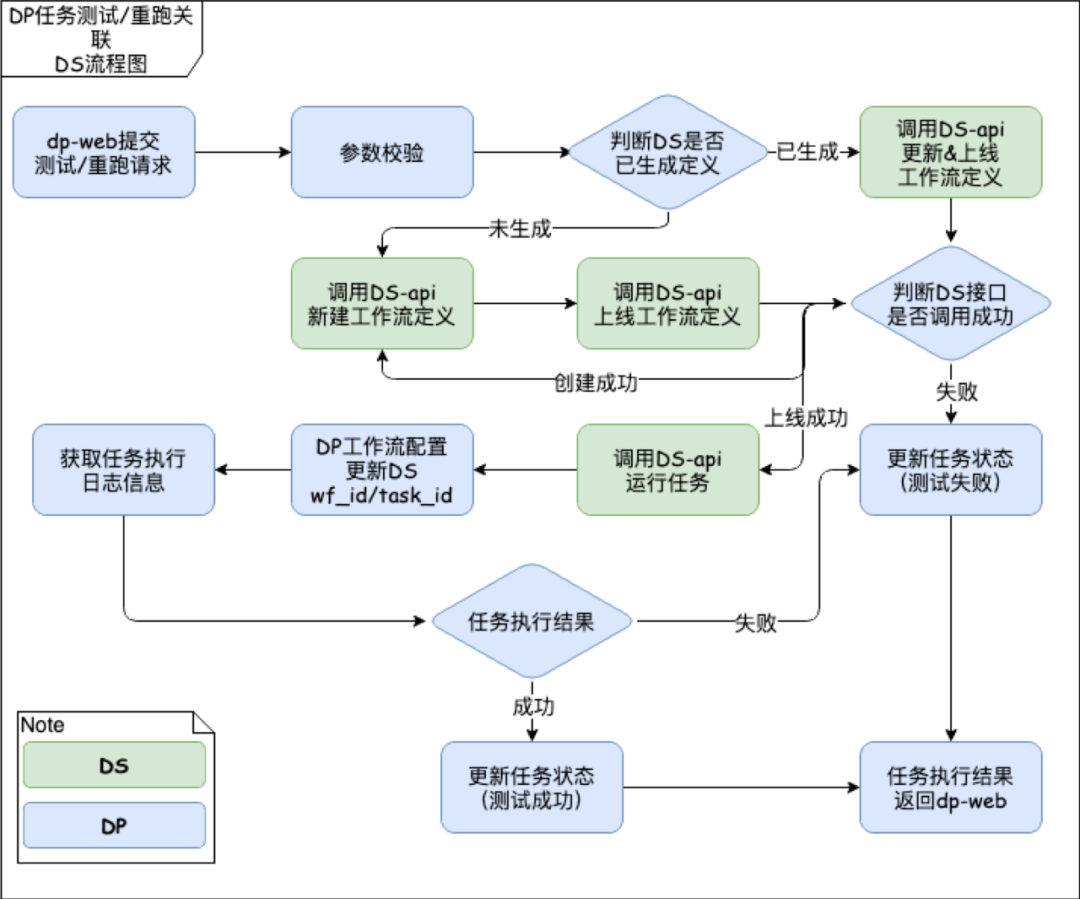 我们梳理了DS工作流定义状态,因为DS的工作流定义与定时管理是会区分两个上下线状态,而DP平台的工作流配置和定时配置状态是统一的,因此在任务测试和工作流发布流程中,我们需要对DP-DS的流程串联做相应的改造。