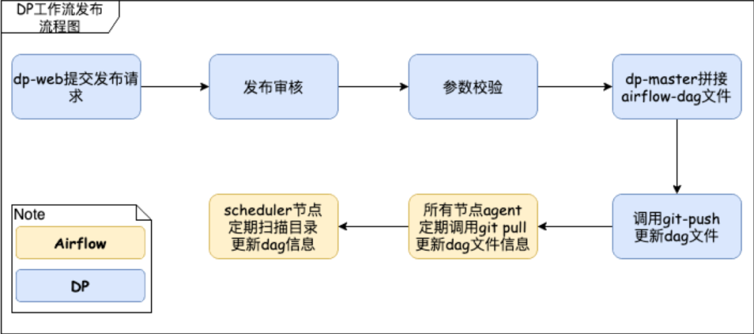 对于工作流上线(发布)流程,原先的DP-Airflow流程主要还是拼接并同步Dag文件到指定目录由scheduler节点进行扫描加载。