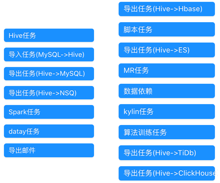 DS已支持的任务类型(Hive SQL任务、DataX任务、Spark任务等):只需要基于我们的实际使用场景对DS对应的任务模块做一些定制化的改造。