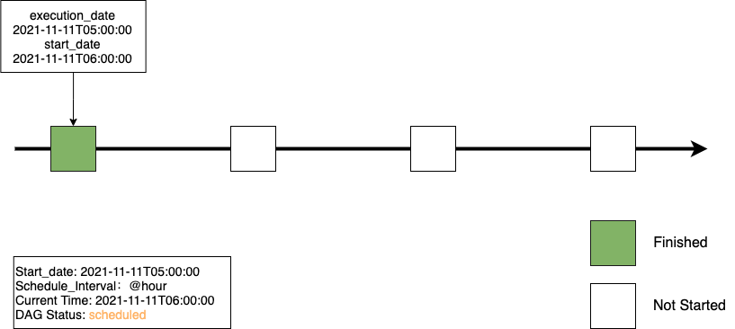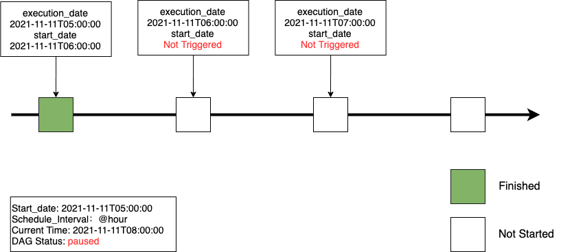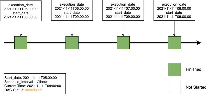 调度自动回补机制是DP实际生产环境中的一个核心能力,其使用场景是当调度系统异常或者资源不足时,可能会导致部分任务错过当前调度触发时间,当恢复调度后,通过Airflow的Catchup机制会自动补齐未被触发的调度执行计划。对于Catchup机制原理可以看一下下图示例:
