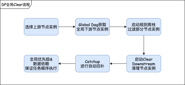 跨Dag全局补数的使用场景一般出现在核心上游表产出异常导致下游商家展示数据异常,一般这种情况下都需要能快速重跑整个数据链路下的所有任务实例来恢复数据正确性。我们的方案就是通过改造了Airflow的Clear功能,通过元数据的血缘解析获取到指定节点当前调度周期的所有下游实例,通过规则剪枝策略过滤部分无需重跑实例,最后启动clear Downstream清除任务实例信息,利用Catchup机制进行自动回补,同时通过任务全局优先级和数据依赖保证任务的顺序执行。DS因为没有跨Dag全局补数的能力,因此我们基于Airflow的全局补数原理,对DS侧进行了相应的改造。与DP现有的补数流程基本保持一致。