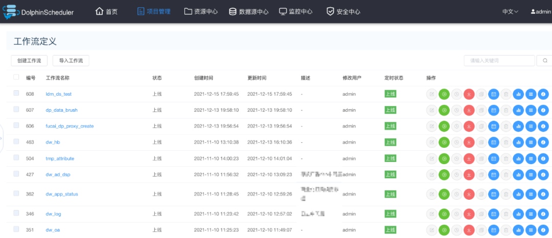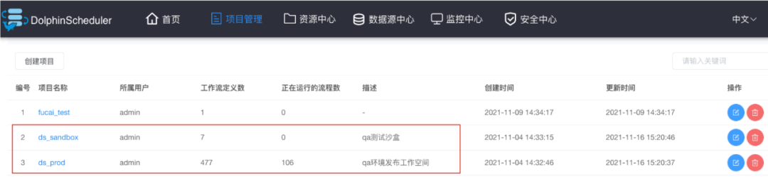 DP平台目前已经在测试环境中部署了部分DS服务,并迁移了全量工作流,实现QA环境的调度任务双跑。对接DolphinScheduler API后,因为用户体系是直接在DP Master上进行维护,因此DS平台在用户层面统一使用admin用户。同时所有的工作流配置信息会基于Project区分测试环境和正式环境。