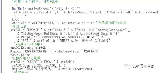 上述代码首次要构建一个字符串然后用在SQL中:这个字符串的组成其实要说明的是两个表(工作表和数据表)中的字段相同。
