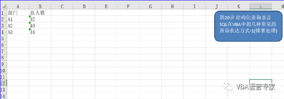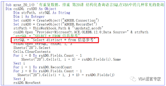 其中,”查询表达式”可以是下列之一或其组合,或者多种方式的组合,用逗号搁开:(1)星号(*)表示“数据源”的所有字段。(2)字段名(3)常量表达式(4)任何有效的计算表达方式这类查询的SQL语句我们已经用了非常多了:如 strSQL = "SELECT * FROM 员工信息"l注意点:1) 有时使用AS重新命名字段名称 当查询表达式使用“字段名”时,字段名就是其本身,使用“常量表达式”和“任何有效的计算表达方式”时,系统将为该字段重新命名一个字段名,这个字段名通常没有意义,这时可以在表达式中使用AS为字段重新命名,当然对字段名也可以通过使用AS为其重新命名。AS并不对查询结果造成实质影响。下面是使用AS的一个例子:strSQL = "Select 班级,姓名 AS 名字,语文+数学+英语 AS 总成绩 from员工信息"2) 使用DISTINCT删除重复记录例如:在“员工信息”表中有重复记录,如果希望若干重复的记录只显示一条,可以使用DISTINCT进行限定。 strSQL = "Select distinct * from 员工信息"例如:数据库中信息参考表内容如下:上述数据中很多是有重复的。我们可以用下面的代码进行排重处理:Sub mynz_20_1() '有重复数据,排重 第20讲 结构化查询语言SQL在VBA中的几种常见的查询表达方式Dim cnADO, rsADO As Object Dim strPath, strSQL As String Dim i As Integer Set cnADO = CreateObject("ADODB.Connection") Set rsADO = CreateObject("ADODB.RecordSet") strPath = ThisWorkbook.Path & "\mydata2.accdb" cnADO.Open "Provider=Microsoft.ACE.OLEDB.12.0;Data Source=" & strPath 'strSQL = "SELECT * FROM 信息参考" strSQL = "Select distinct * from 信息参考" rsADO.Open strSQL, cnADO, 1, 3 Sheets("20").Select Cells.ClearContents For i = 0 To rsADO.Fields.Count - 1 Sheets("20").Cells(1, i + 1) = rsADO.Fields(i).Name Next i For i = 1 To rsADO.RecordCount For j = 0 To rsADO.Fields.Count - 1 Sheets("20").Cells(i + 1, j + 1) = rsADO.Fields(j) Next j rsADO.MoveNext Next i rsADO.Close cnADO.Close Set rsADO = Nothing Set cnADO = NothingEnd Sub部分代码截图: 运行后显示数据: