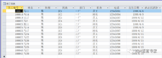 这种方式可以通过使用Where可以设置查询条件,查询的条件表达式可以是:(1)任何逻辑表达式 如:strSQL = "SELECT * FROM 员工信息 WHERE 部门='一厂'"这种查询在之前的讲解中讲过,这里不再举例。(2)IN/NOT IN ( 表达式1,表达式2,…. ) 注意上面的括号不可少,各表达式用逗号搁开。 '查询姓名在括号中列出名单范围内的人,如总数据如下:我们要显示的是姓名为马17和张11的信息,SQL语句如下:strSQL = "SELECT * FROM 员工信息 where 姓名 in ('马17','张11')" 代码如下:Sub mynz_20_2() '总数据内的数据指定显示 第20讲 结构化查询语言SQL在VBA中几种常见的查询表达方式 Dim cnADO, rsADO As Object Dim strPath, strSQL As String Dim i As Integer Set cnADO = CreateObject("ADODB.Connection") Set rsADO = CreateObject("ADODB.RecordSet") strPath = ThisWorkbook.Path & "\mydata2.accdb" cnADO.Open "Provider=Microsoft.ACE.OLEDB.12.0;Data Source=" & strPath 'strSQL = "SELECT * FROM 员工信息" strSQL = "SELECT * FROM 员工信息 where 姓名 in ('马17','张11')" rsADO.Open strSQL, cnADO, 1, 3 Sheets("20").Select Cells.ClearContents For i = 0 To rsADO.Fields.Count - 1 Sheets("20").Cells(1, i + 1) = rsADO.Fields(i).Name Next i For i = 1 To rsADO.RecordCount For j = 0 To rsADO.Fields.Count - 1 Sheets("20").Cells(i + 1, j + 1) = rsADO.Fields(j) Next j rsADO.MoveNext Next i rsADO.Close cnADO.Close Set rsADO = Nothing Set cnADO = NothingEnd Sub代码截图和运行结果如下图: