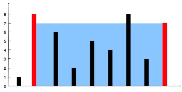 给你 n 个非负整数 a1,a2,...,an,每个数代表坐标中的一个点 (i, ai) 。在坐标内画 n 条垂直线,垂直线 i 的两个端点分别为 (i, ai) 和 (i, 0) 。找出其中的两条线,使得它们与 x 轴共同构成的容器可以容纳最多的水。