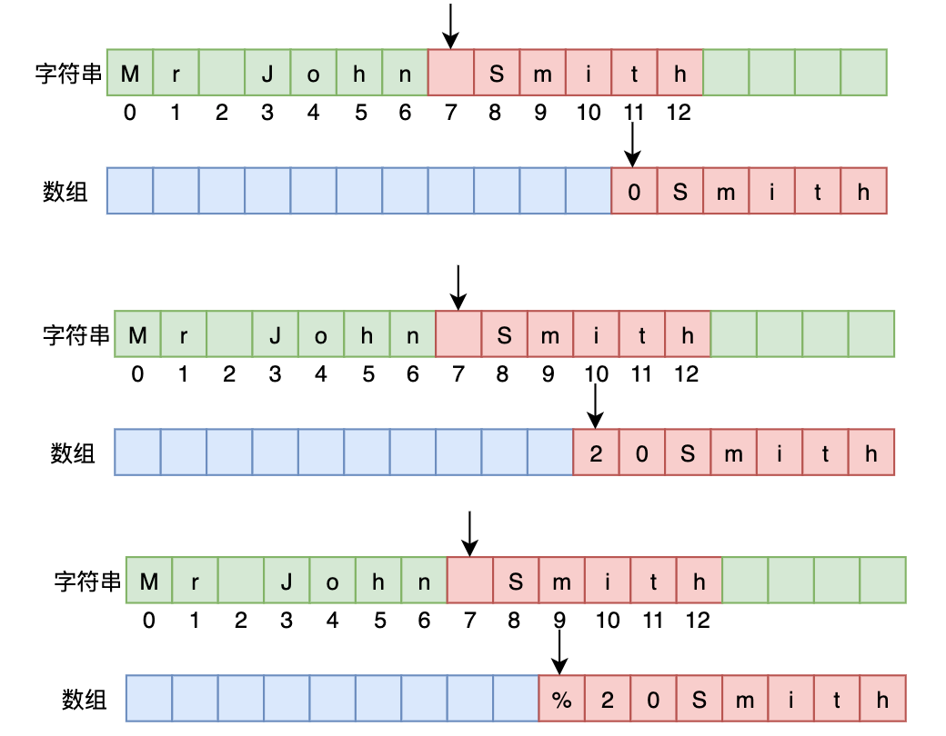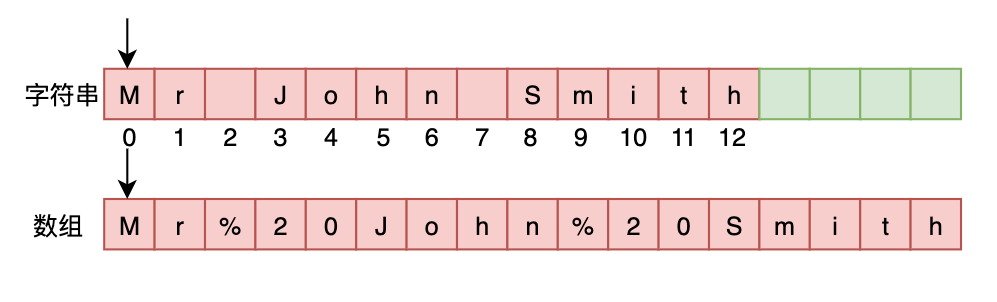 其实这道题,貌似做过,但是有点不太一样,这里多了一个字符串的真实的长度,所谓真实的长度,就是我们用到的真正长度,后面可能是多出来的空格,只是为了保证我们转成为数组之后,替换掉里面空格,也是有足够的空间放得下,比如:Mr John Smith