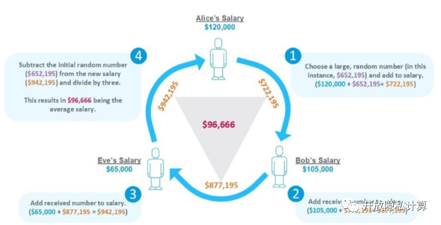 为了说明这一点,我们来讨论一个例子(图1)。约翰、莎拉和吉尔想知道他们的集体平均工资是多少,然而他们都不想告诉其他人他们的工资,因为他们害怕自己的工资最低。使用MPC,每个参与者将输入他们的工资,而不向其他参与者透露他们的工资是多少,MPC协议将告诉小组的平均工资是多少。每个学生只知道自己的工资和计算的结果--三个人的平均工资。