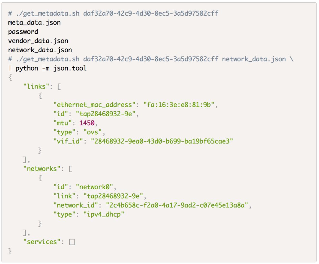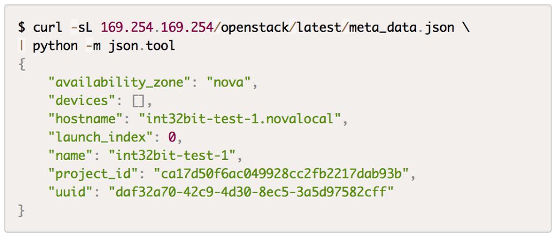 从以上输出可见从metadata服务中我们获取了虚拟机的uuid、name、project id、availability_zone、hostname等。