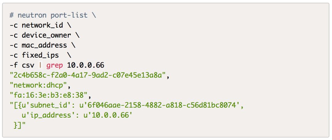 我们可以看到169.254.169.254的下一跳为10.0.0.66。10.0.0.66这个IP是什么呢?我们通过Neutron的port信息查看下: