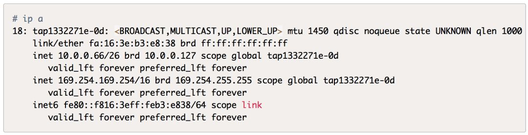 从路由表中看出169.254.0.0/16是从网卡tap1332271e-0d发出去的,我们查看网卡地址信息: