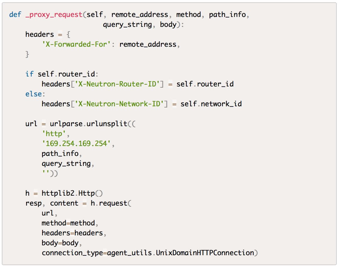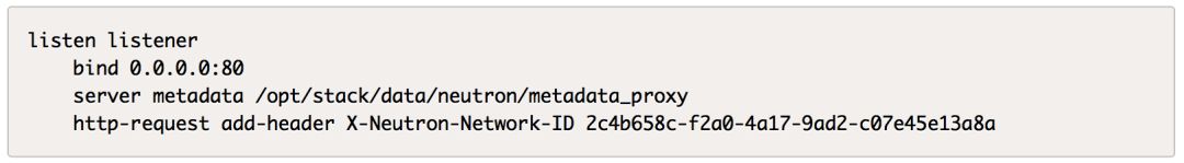 另外需要注意的是,新版本的OpenStack是直接使用haproxy代理转发的,在一些老版本中则使用neutron-ns-metadata-proxy进程负责转发,实现的代码位于neutron/agent/metadata/namespace_proxy.py: