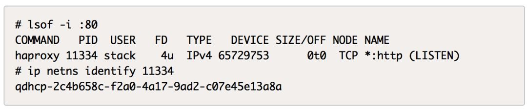 第一个问题其实前面已经解决了,haproxy是在虚拟机所在网络的DHCP namespace中启动的,不同的namespace网络栈相互隔离,因此不会存在端口冲突。我们可以验证: