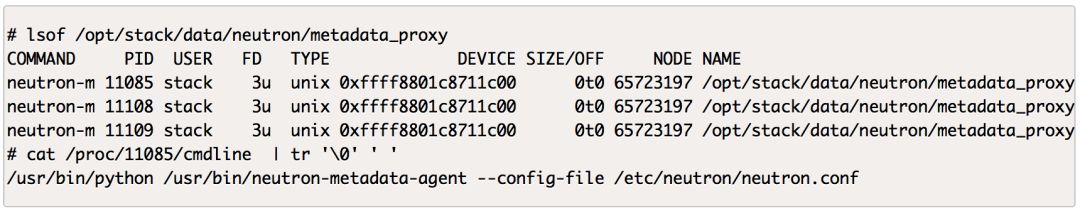 前面说到,haproxy会把Metadata请求转发到本地的一个socket文件中,那么,到底是哪个进程在监听/opt/stack/data/neutron/metadata_proxysocket文件呢?我们通过lsof查看下: