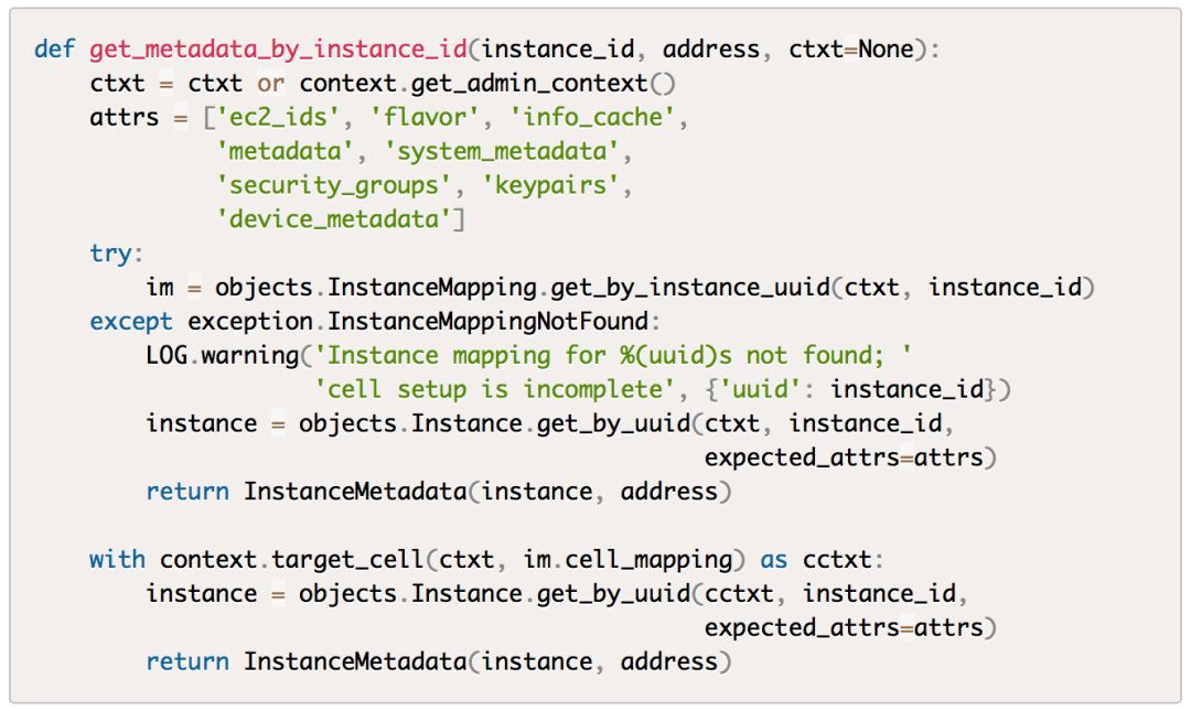 此时Nova Metadata就可以通过虚拟机的uuid查询metadata信息了,代码位于nova/api/metadata/base.py: