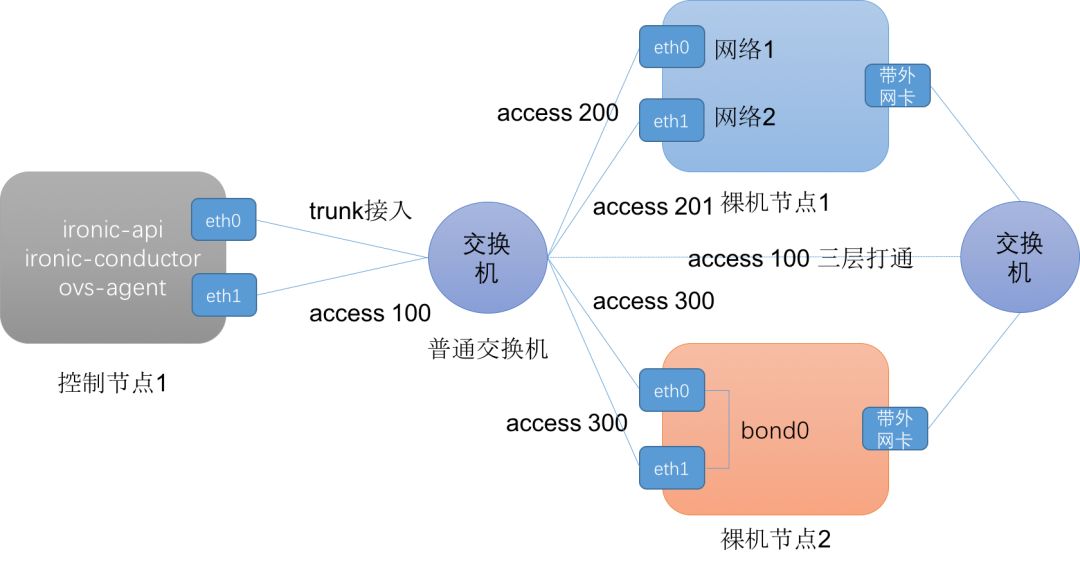 网卡2(eth1):Access接入,OpenStack管理网,用于OpenStack的各个组件通信。该网络三层打通了物理服务器的带外网络访问关系,用于调用IPMI指令。