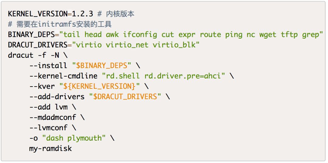 我们受DIB工具dracut-ramdisk element的启发(感谢社区),研究了其生成initramfs的方法,并结合我们对LVM的需求,实现了能够兼容我们目前使用到的所有机型(如Dell GW730XD、ProLiant DL380 Gen9)initramfs生成方法,部分脚本如下:
