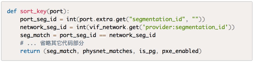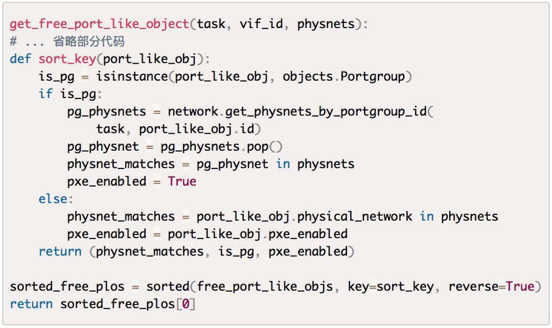 我们的场景通常都需要配置多网络,但不能要求用户严格按照裸机网卡的录入顺序选择网络,因此我们对网卡选择策略进行了优化。在裸机port录入时,我们添加了segmentation_id标签(extra key),在物理网卡选择时,如果Neutron的port关联的network的segmentation_id与ironic port的segmentation_id一致,则优先选择该物理网卡,实现的部分代码如下: