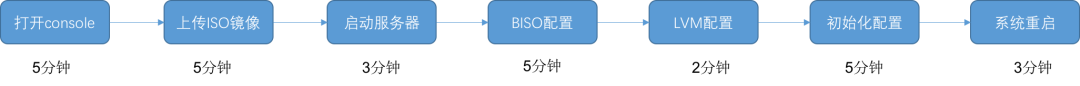 如上这些步骤几乎都是必须人工交互的重复体力工作,难以做到并行批量装机,一台物理服务器完成操作系统安装大概需要20多分钟的时间,耗费了工程师大量的精力和时间,并且难以实现快速交付。