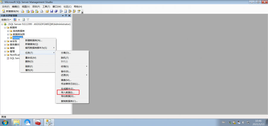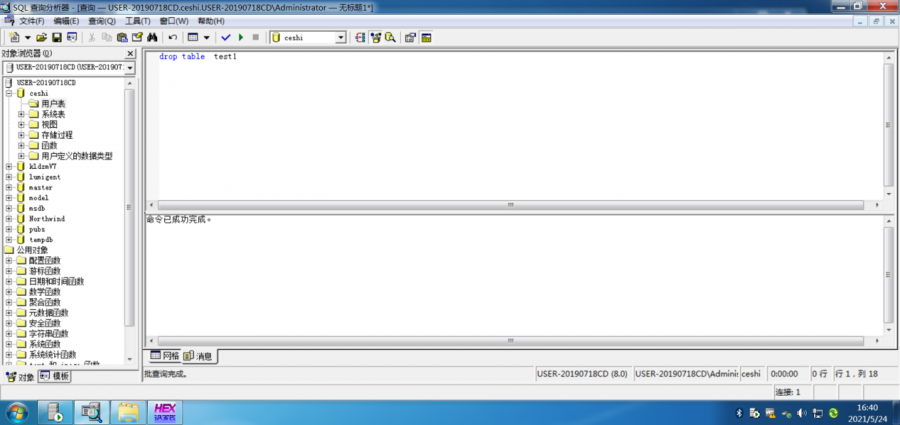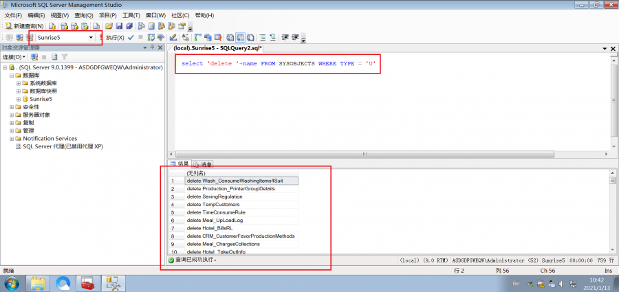 (1)执行语句select 'delete '+name FROM SYSOBJECTS WHERE TYPE = 'U' ,查询结果会针对这个数据库,生成删除这个数据库所有表的语句。