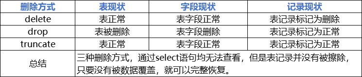 3. truncate table 数据表 —— 删除整张表内容(只删除数据,保留表结构),没有保存具体删除日志,会截断数据并释放空间。