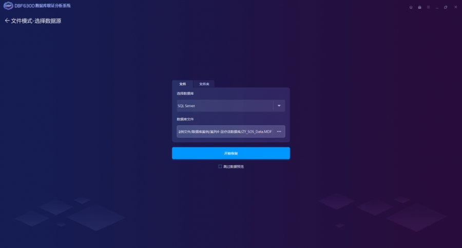 1. 打开DBF6300数据库取证分析系统,选择文件模式,扫描需要恢复的数据库文件。